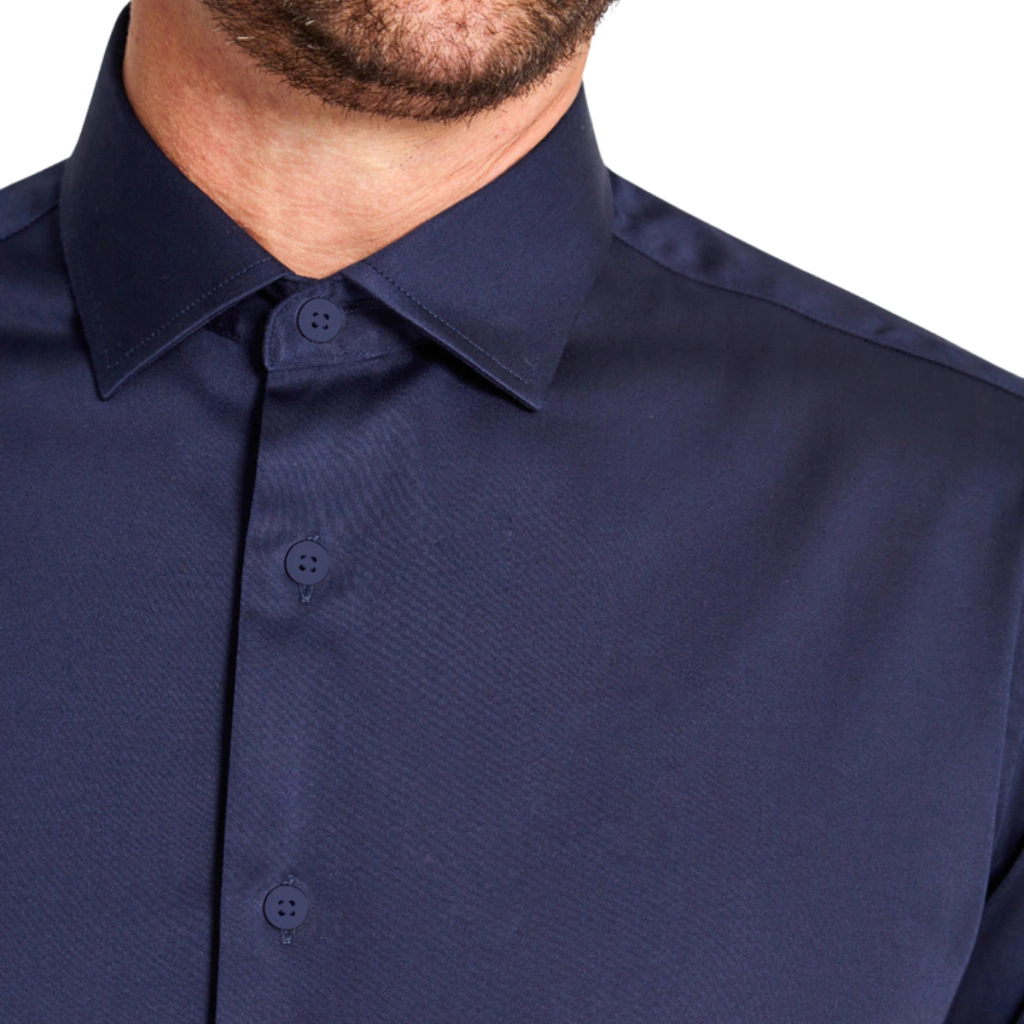 A Camisa Slim Fit Luxo é confeccionada em tecido acetinado de algodão com elastano fio 50, oferecendo elegância, conforto e um caimento impecável. Sua modelagem slim valoriza a silhueta, enquanto o colarinho curto, a rigidez média e as mangas longas com abotoamento nos punhos garantem um visual moderno e sofisticado. Possui barra arredondada e fechamento frontal por botões.